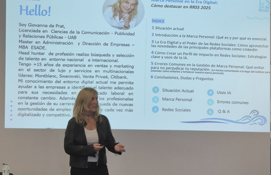 Giovanna de Prat compartió recomendaciones prácticas sobre cómo optimizar perfiles, generar contenido alineado con los objetivos profesionales y evitar errores habituales que pueden perjudicar la reputación digital. Además, se analizó el papel de la inteligencia artificial como herramienta de apoyo para potenciar la marca personal, así como las tendencias que marcarán el posicionamiento profesional de cara a 2025.